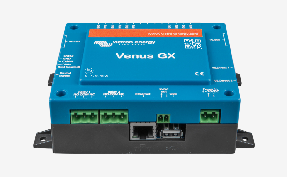 The Venus GX provides intuitive control and monitoring for all Victron power systems. The list of Victron products that can be connected is endless: Inverters, Multis, Quattros, MPPT solar chargers, BMV battery monitors, Lynx Ion + Shunt and more.