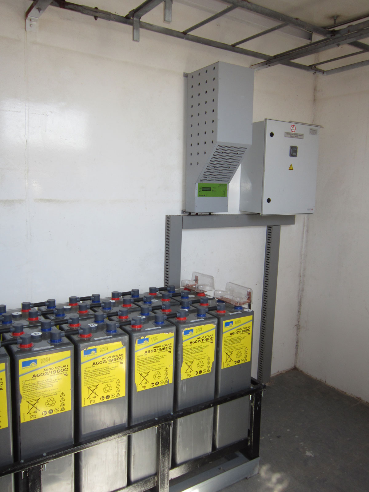 El sistema consta de un Aerogenerador Bornay 6000 de carga un banco de baterías de GEL OPzV a 48 voltios.